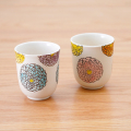 温かみのあるベージュの生地に、パステルカラーの花模様が特徴のお茶碗は、